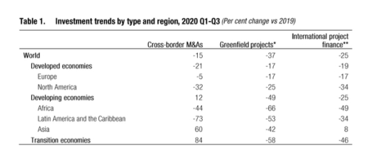 10月27日,联合国贸发会议发布最新一期《全球投资趋势监测报告》。报告指出,鉴于2020年上半年全球外国直接投资(FDI)大幅下降,尤其是欧美发达经济体外国直接投资骤降,报告对全球外国直接投资前景的预测趋于负面,预计全年外国直接投资将下降30%至40%。但中国及东南亚国家的外国直接投资相较其他地区更具韧性,总体趋于稳定。