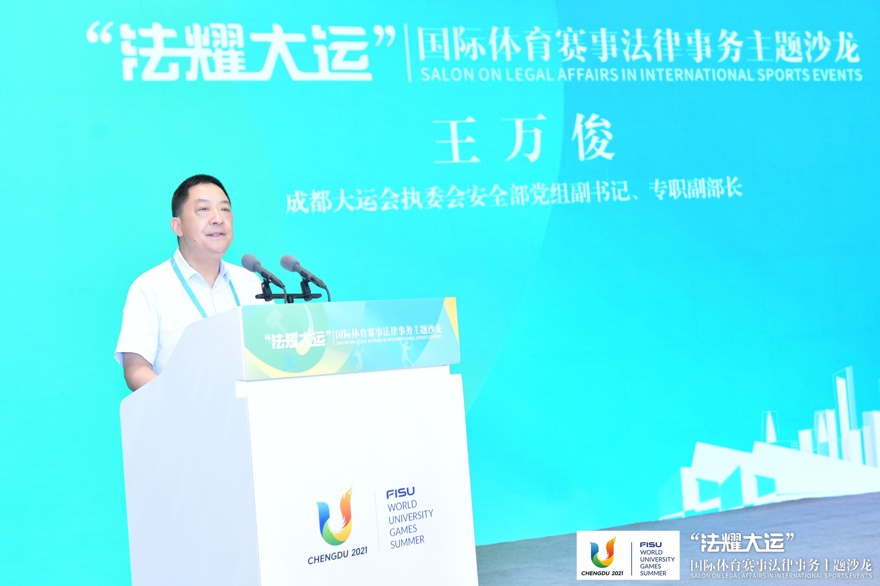 成都大运会执委会安全部党组副书记、专职副部长王万俊在主旨发言中从筹备历程、比赛项目、参赛注册等方面介绍了成都大运会的情况,强调了成都大运会的深刻意义与价值。他还结合赛事法务工作标准化、合同和文件的法律审查、延期合同专项清理、赛区和场馆法务等成都大运会的实际法务工作,从法律法规与赛事惯例的冲突平衡、赛事延期后责任分担、赛事主承协办的确定及安全风险责任分担、赛事筹备的赞助、采购等角度,分析了国际体育赛事中的法律事务难点问题。