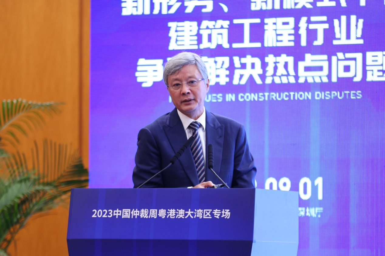2023年9月1日,由中国国际经济贸易仲裁委员会华南分会(以下简称“贸仲华南分会”)、广东省贸促会联合主办,中国国际经济贸易仲裁委员会广东办事处、广东省律师协会、广州市律师协会、深圳市律师协会、深圳建筑业协会协办,威科先行支持的“新形势、新模式下的建筑工程行业争议解决热点问题”——2023中国仲裁周粤港澳大湾区专场活动在深圳成功举办。本次专场活动旨在深度分析行业热点,在新形势、新模式下讨论建筑工程领域最前沿、最热点法律问题,为行业健康发展贡献力量。本次活动吸引近两百名来自广东、广西、湖南等多地的仲裁员、律师、学者、公司法务及各界人士线下参加,逾4500人通过在线直播平台参加本次活动。广东省贸促会党组成员、副会长邱招贤、贸仲华南分会秘书长李云、广东省律协仲裁专业委员会主任赵汉根以及深圳市律师协会会长张斌出席活动并致开幕辞。会议由贸仲华南分会秘书长助理张晓宇主持。