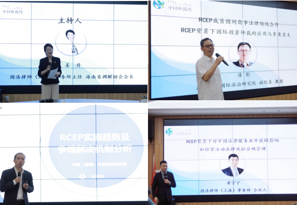 主旨演讲环节由贸仲仲裁员、国浩律师(海南)事务所主任姜丹女士主持。贸仲国际投资争端解决仲裁员、武汉大学国际法治研究院副院长、海外投资法律研究中心主任漆彤教授首先进行发言。他从“合作背景“合作内容”“机遇挑战”三个方面讨论了“RCEP成员间商事法律领域合作”,并围绕“投资仲裁与Ekran案”“RCEP投资章节及投资仲裁规则的缺失”“RCEP成员间投资争端的解决”探讨了“RCEP背景下国际投资仲裁的应用与重要意义”。