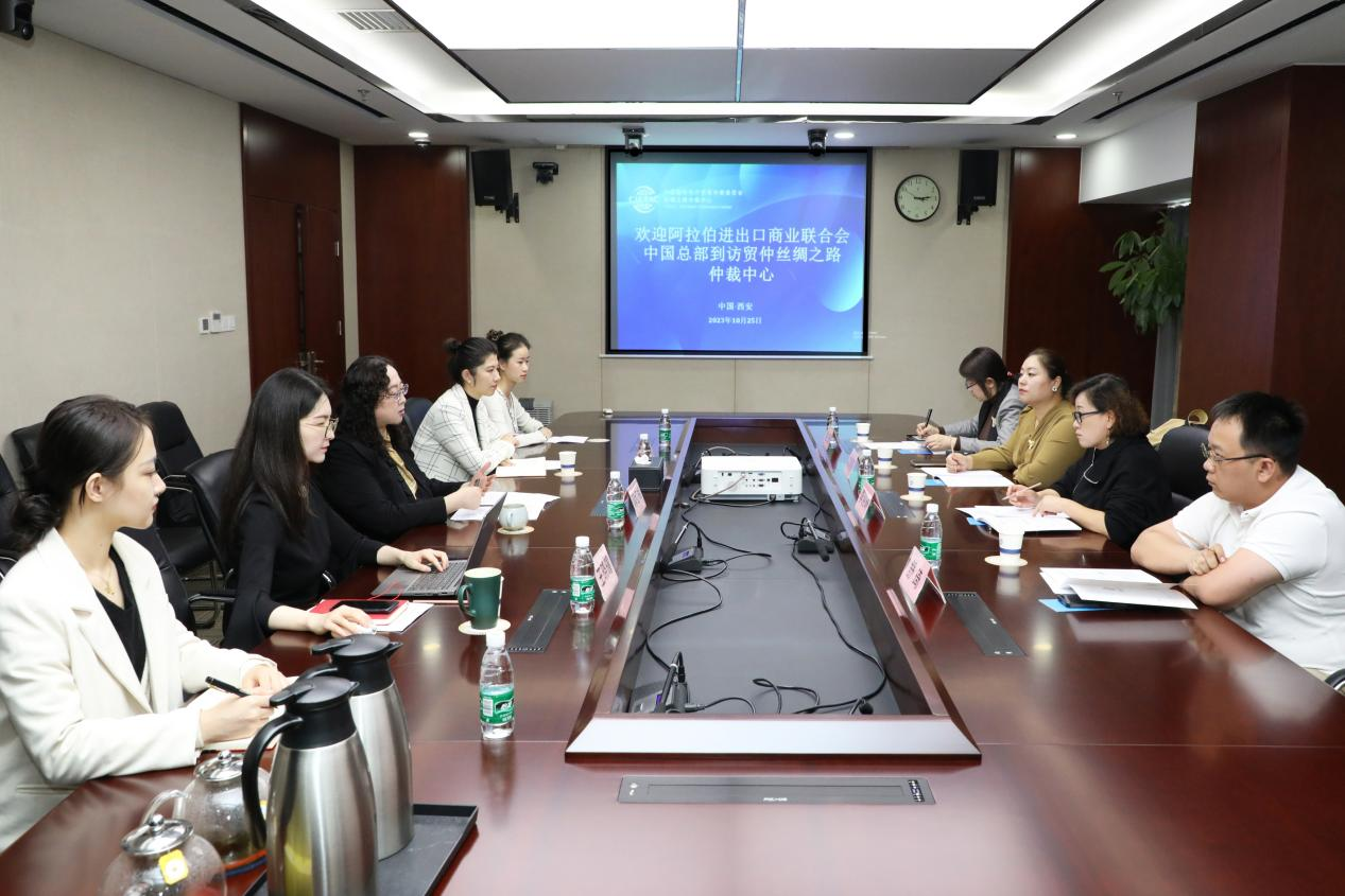 10月25日,阿拉伯进出口商业联合会(简称“联合会”)中国区执行秘书长李迎琳、执行会长尤楷嘉、副会长舒琦、国际事务部主任程珊一行到访中国国际贸易仲裁委员会丝绸之路仲裁中心(简称“贸仲丝路中心”),贸仲丝路中心副秘书长蒋红梅会见接待并座谈。