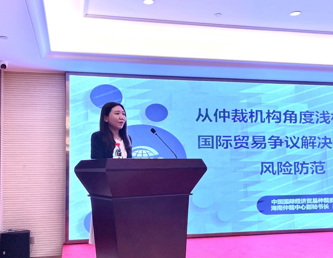 在“涉外商事法律服务”环节,贸仲海南中心副秘书长吕岩女士以“从仲裁机构角度浅析——国际贸易争议解决与法律风险防范”为题,结合国际贸易类案件中的常见问题、分析了仲裁在解决跨国、跨境商事解纷中的重要性。通过对国际仲裁和我国仲裁的现状分析,强调贸仲位列世界最受欢迎的国际仲裁机构之一的优势地位。在“仲裁协议的签订”部分详解了签订有效仲裁协议的注意要素,为与会人员提供了仲裁程序中的风险防范思路。吕岩女士表示,贸仲海南仲裁中心未来将充分发挥贸仲优势,积极就近为区域内商事主体提供便捷高效的多元化解纷服务,为推动海南成为具有国际影响力的争议解决“优选地”做出应有贡献。