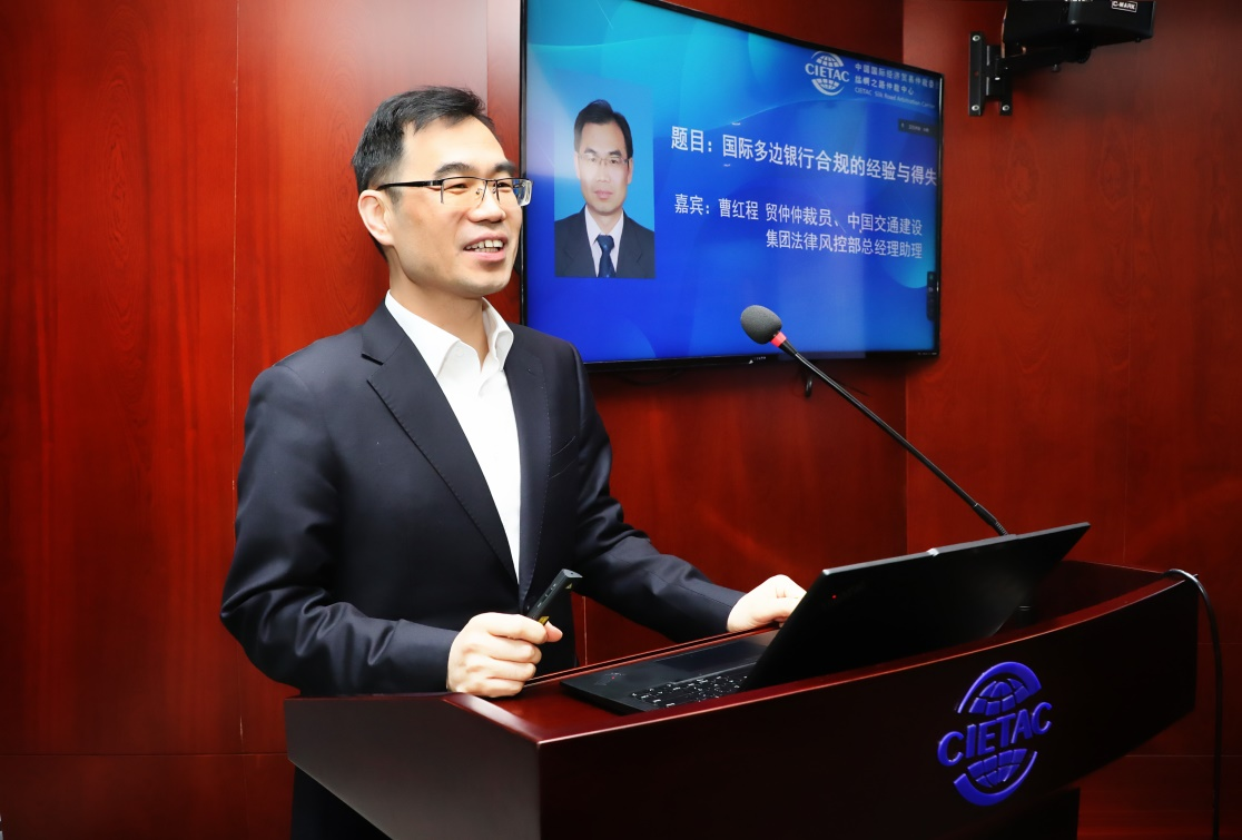 中国交通建设集团有限公司法律风控部总经理助理、贸仲仲裁员曹红程先生以“国际多边发展银行合规管理的经验与得失”为题,分析了国际多边发展银行的合规要求、违规制裁等内容,并以中交集团的合规管理实践,对企业涉外合规体系的构建、合规理念的形成以及合规信息化建设等内容进行全方位分享。