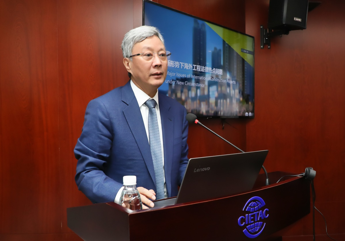 在研讨环节,北京海外君合工程咨询有限公司董事长、贸仲仲裁员崔军先生以“新形势下海外工程法律热点问题”为题,阐述了中国对外承包工程市场新格局和中国企业国际工程主要风险,并结合多年的实务经验和行业观察,对国际工程中面临的索赔时效、满足使用功能、工期延误违约金、新能源工程争议、终止合同争议、履约保函索兑等主要法律问题进行了深入讲解。