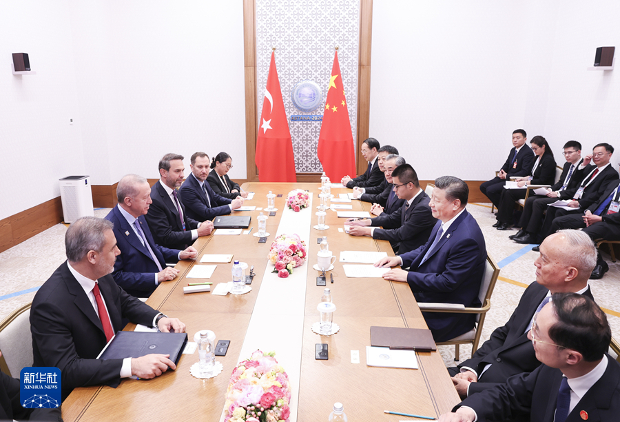 当地时间7月4日下午,国家主席习近平在阿斯塔纳出席上海合作组织峰会期间会见土耳其总统埃尔多安。新华社记者 庞兴雷 摄