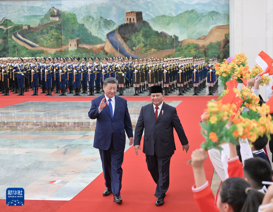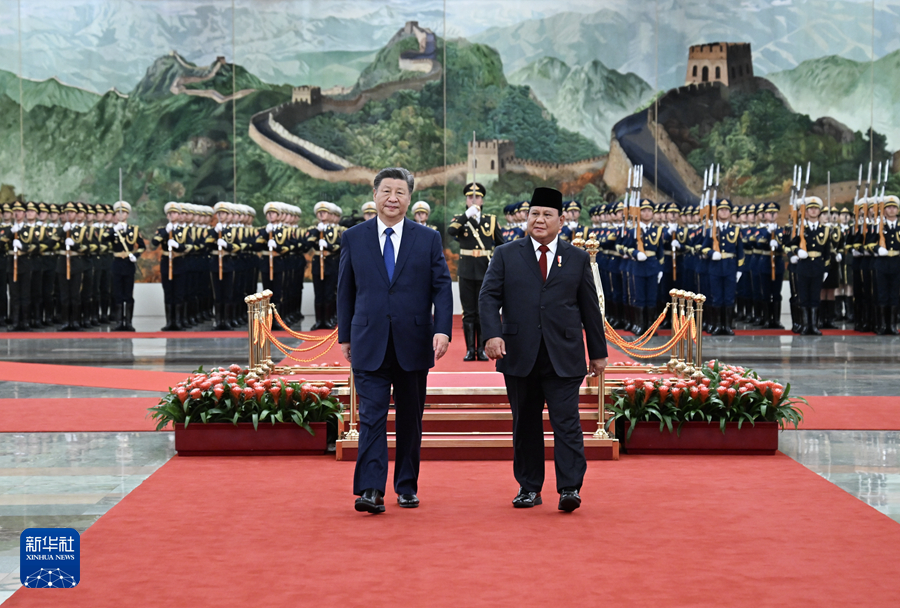 11月9日下午,国家主席习近平在北京人民大会堂同来华进行国事访问的印度尼西亚总统普拉博沃举行会谈。这是会谈前,习近平在人民大会堂北大厅为普拉博沃举行欢迎仪式。新华社记者 谢环驰 摄