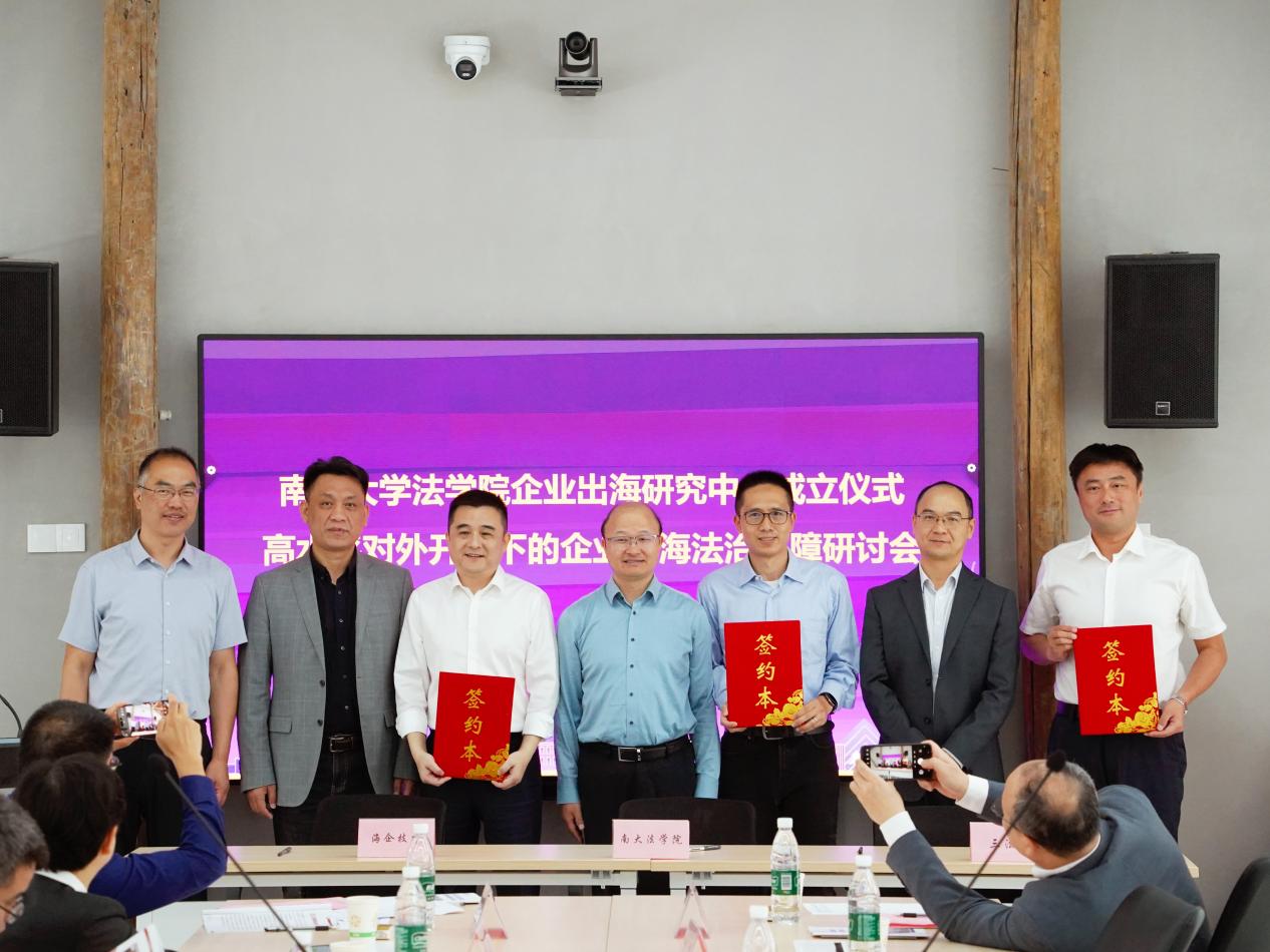 随后,南京大学法学院副院长杨阳、江苏三法律师事务所管理合伙人杨冬和江苏海外集团国际技术工程有限公司总经理陈亮共同签署企业出海研究中心合作共建协议。南京大学法学院党委书记蒋恩铭、南京市玄武区司法局局长刘必军、江苏海外集团国际技术工程有限公司董事长林敏和江苏三法律师事务所主任张超等人共同为“南京大学法学院企业出海研究中心”揭牌。