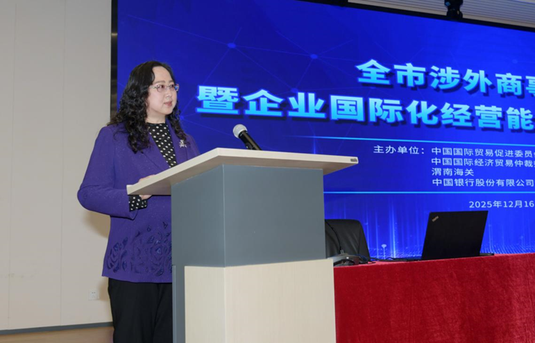 12月16日,由中国国际贸易促进委员会渭南市支会(简称“渭南市贸促会”)联合中国国际经济贸易仲裁委员会丝绸之路仲裁中心(简称“贸仲丝路中心”)、渭南海关、中国银行股份有限公司渭南分行共同主办的“全市涉外商事法律暨企业国际化经营能力提升培训会”在渭南市成功举办。贸仲丝路中心副秘书长蒋红梅出席培训并致辞,渭南市贸促会副会长杨玉婷主持培训。