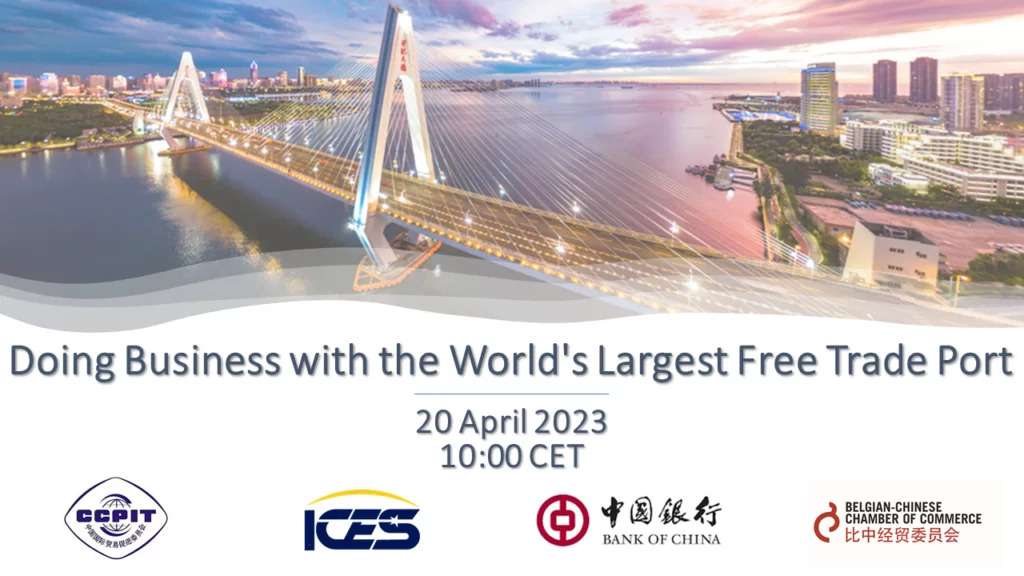 The hybrid event "Doing Business with the World's Largest Free Trade Port", taking place on April 20, 2023 at 10:00 CET (16:00 CST), orgnaized by China Council for the Promotion of International Trade (CCPIT) Representatinve Office in the EU( Belgium), the Institute for China-Europe Studies (ICES), the Belgian-Chinese Chamber of Commerce and Bank of China (Europe) S.A. Brussels Branch, will be organizing will bring together experts and practitioners from both Europe and China (Hainan in particular) for a two-way exchange and discussion on the above topics, to further enhance mutual understanding and explore potential opportunities and challenges in order to contribute to a more dynamic and mutually beneficial Europe-China economic relationship.