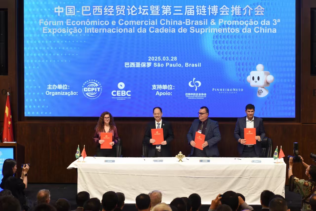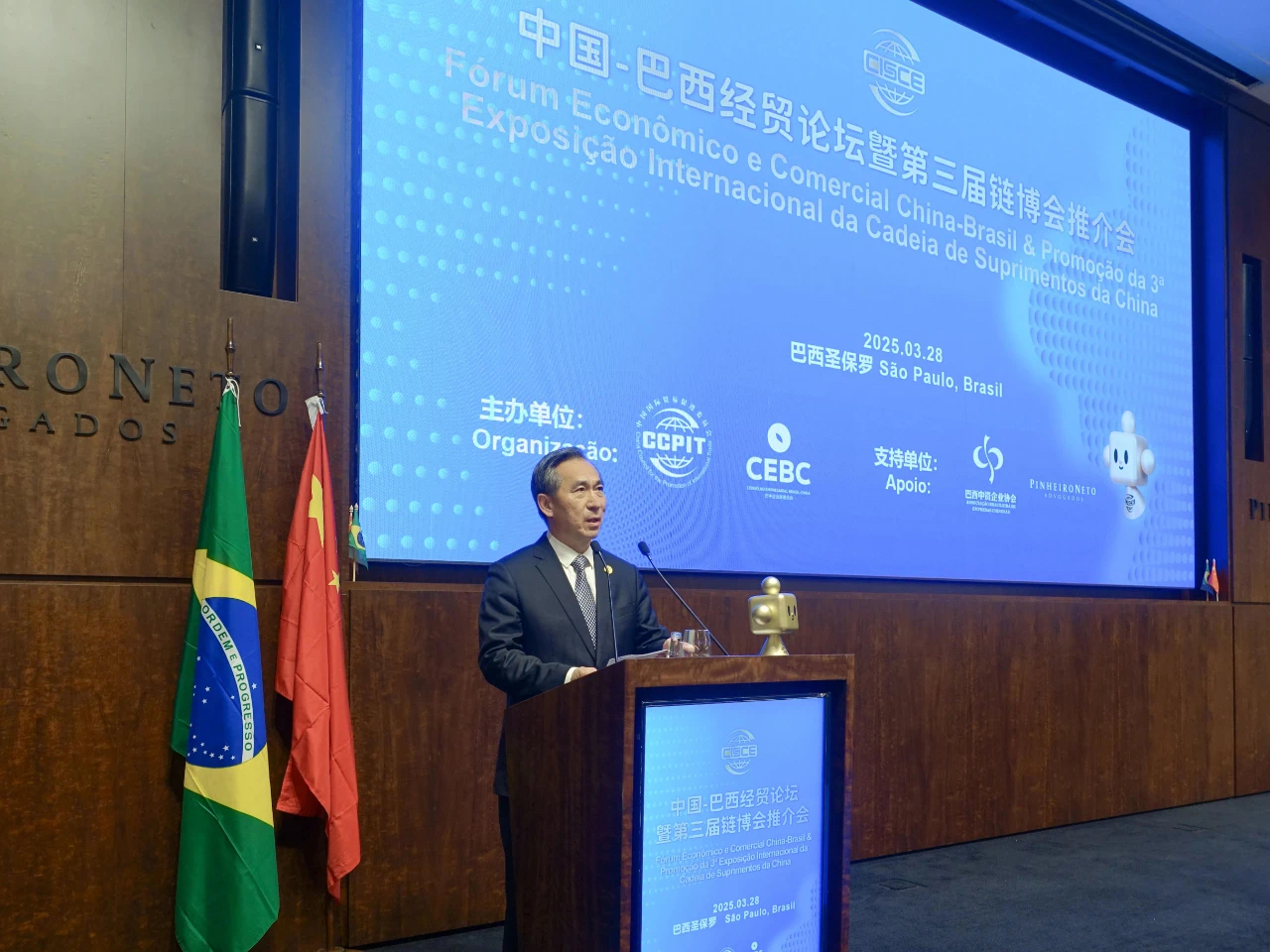 3月28日,中国-巴西经贸论坛在巴西圣保罗举行。中国贸促会会长任鸿斌、巴中企业家委员会主席内维斯、中国驻圣保罗总领事余鹏等出席会议并致辞。
