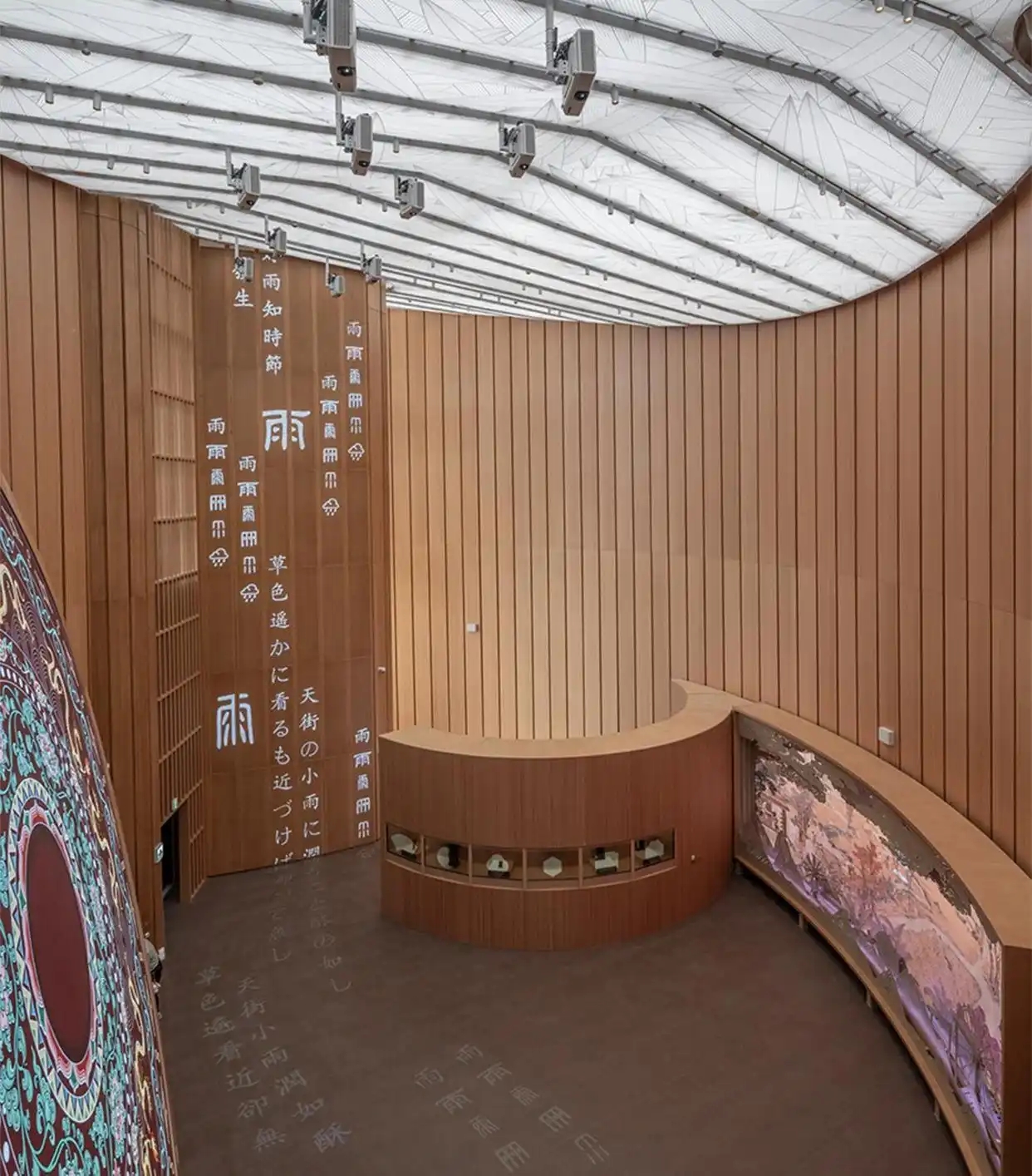 中国馆设计中,将建筑与展陈、室内与室外融合设计,统一以中华书简为语汇,将建筑形态转化为展陈的叙事语言,让建筑会讲中国故事。通过“过去—天人合一,现在—绿色发展,未来—生生不息”三个展陈篇章,使建筑的内部空间与展陈叙事结构起承转合,让观众能够以多种方式与自然“亲密接触”,向世博会展现“人与自然和谐共生”的生态文明观。