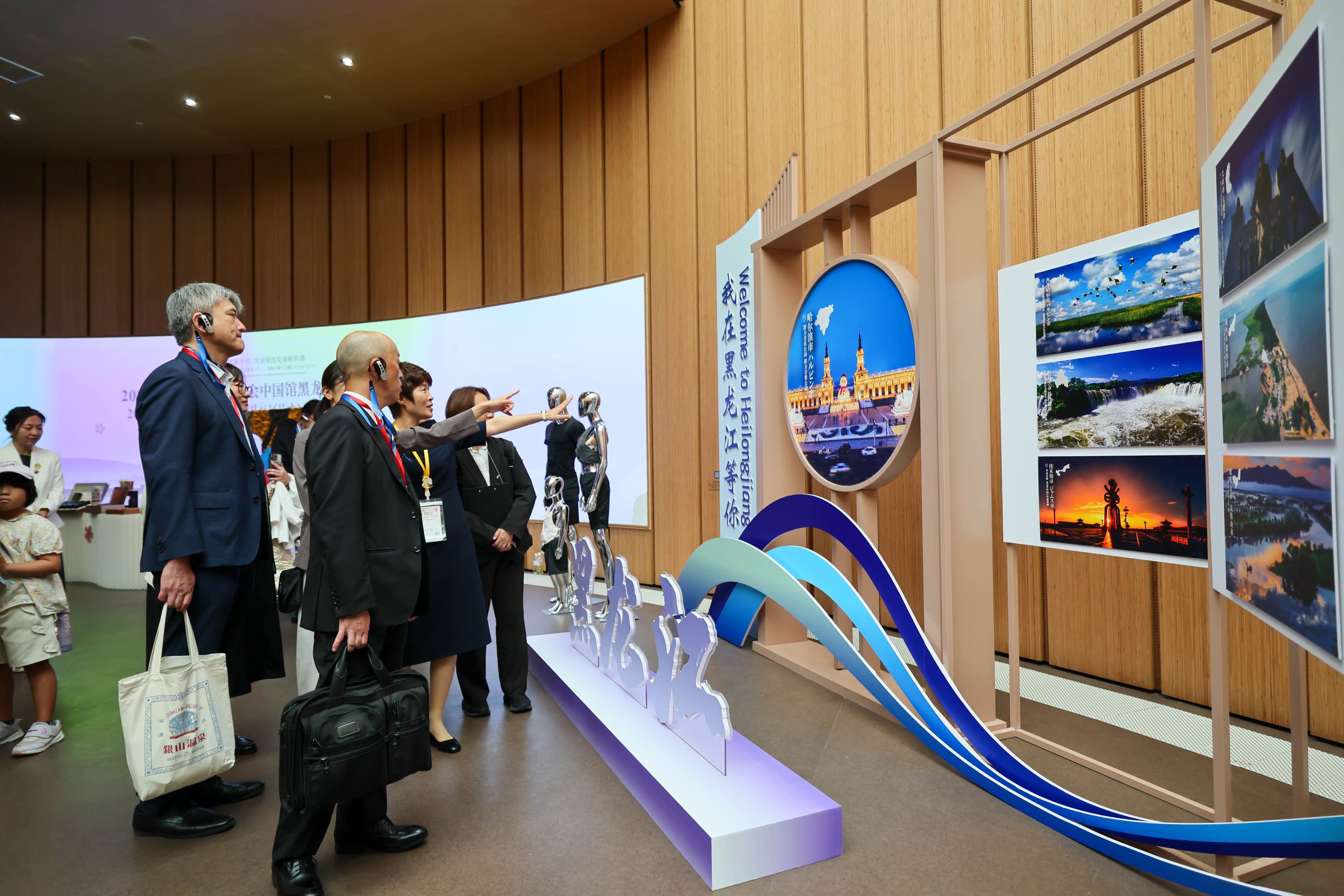 展览展示环节亮点十足,近百种精选展品构成了一幅立体生动的“龙江画卷”。水下环境监测机器人深入水域精准探测生态数据,为水资源管理提供强大技术支撑;智能心电衣打破健康监测的时空限制,诠释“健康中国”的民生温度;自然采光窗帘以科技调节光影,践行绿色低碳的发展理念,一系列科技创新成果彰显着龙江在智能制造、健康科技等领域的前沿探索。北沉香工艺品纹理独特、香气醇厚;冰花瓷晶莹剔透,宛如北国冰雪凝结而成的艺术品;满绣龙袍则以精湛的刺绣技艺再现满族文化的辉煌,以一针一线的坚守与创新,诉说非遗传承中蕴含的文化自信。“黑土优品”“九珍十八品”的精彩亮相,让世界感受到寒地黑土孕育出的卓越品质。这些展品共同勾勒出龙江在生态、文化、产业等领域的独特优势,展示了高质量发展的多元活力。