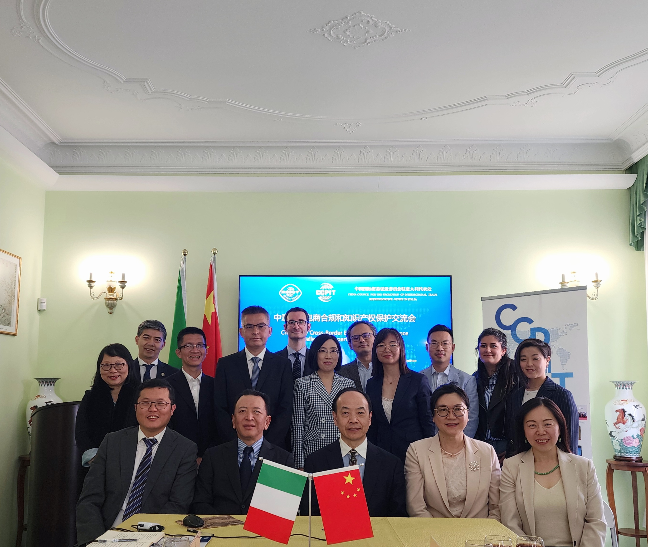 4月24日,驻意大利代表处总代表姚鲁杰会见广东省贸促会副会长崔爽带领的代表团,并邀请当地商协会、经贸及法律界代表近20人,在代表处办公室举办中意跨境电商合规合知识产权保护交流会,驻米兰总领馆经商处参赞耿协威出席并致辞。
