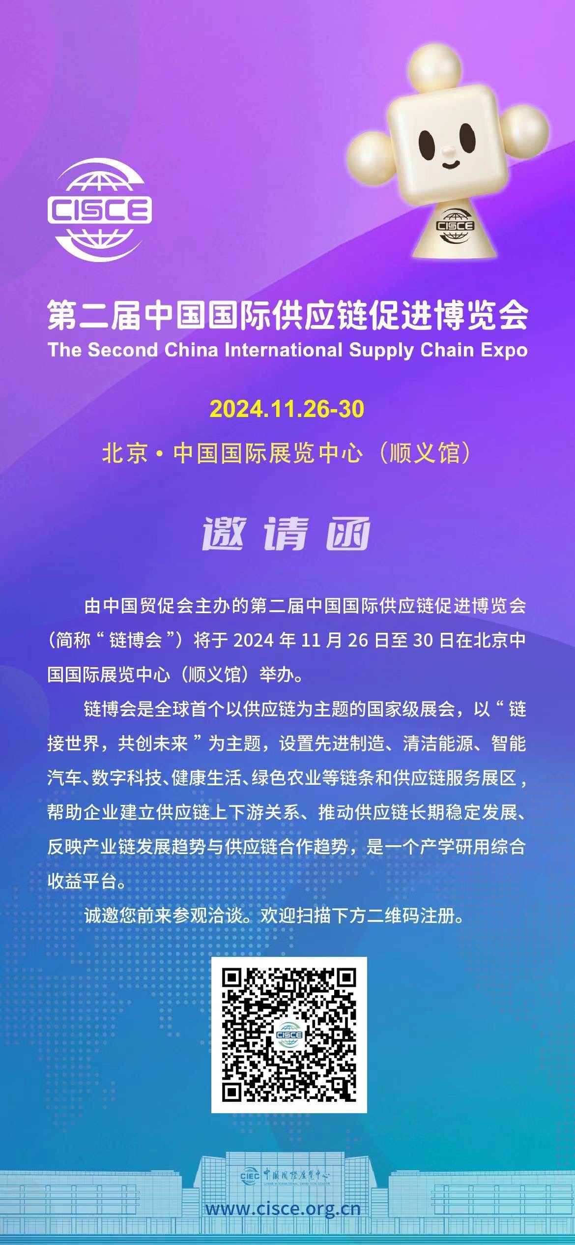 由中国贸促会主办的第二届中国国际供应链促进博览会(简称“ 链博会 ”)将于2024 年 11月 26 日至 30 日在北京中国国际展览中心(顺义馆)举办。
